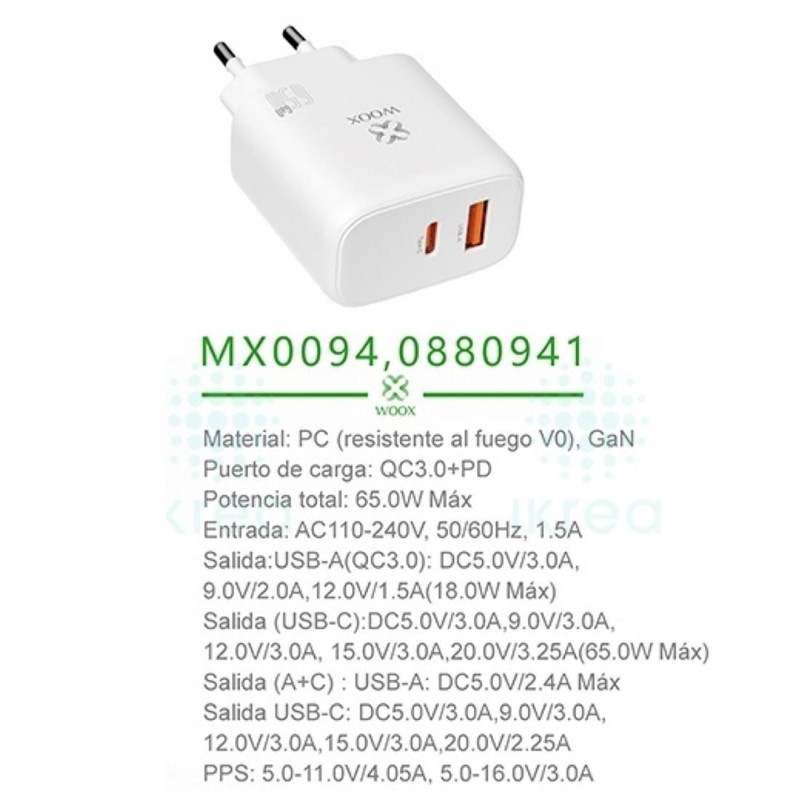 Woox MX0094 Cargador de Pared PD+QC USB-A + USB-C GaN 65W