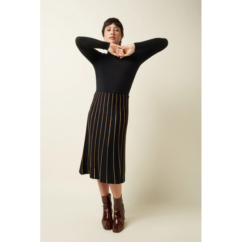 La falda de punto Knit Skirt Plume de King Louie destaca por su estilo midi acampanado, ideal para aportar movimiento y elegancia a cualquier conjunto. Se ajusta cómodamente con una cintura elástica de talle medio, y el tejido incluye rayas o detalles sutiles que enriquecen su textura. Está confeccionada en una mezcla de 90 % algodón, 5 % cashmere y 5 % poliéster, lo que le confiere suavidad premium, un tacto cálido y buena caída. La longitud midi y el corte flare la convierten en una pieza versátil que puede combinarse con botas altas para un estilismo otoñal o con sneakers y blazer para un look urbano refinado. Detalles del producto: * Material: 90 % algodón, 5 % cashmere, 5 % poliéster.  * Corte: midi, pierna flare/acampanada * Cintura: elástica (facilita ajuste confortable) * Color: negro (versión “Black – Plume”)  * Marca: King Louie * Modelo mide 1,70 m y lleva talla S.