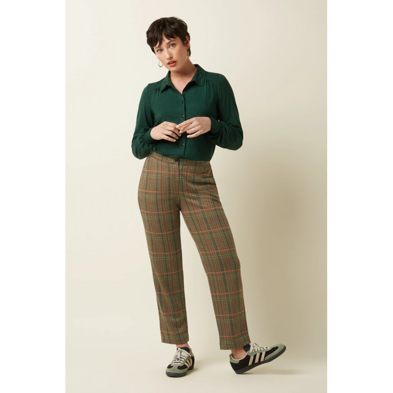 Pantalón de estilo estructurado y moderno, confeccionado con tejido jersey de gran elasticidad que garantiza comodidad y caída impecable. Diseñado con cintura media, trabillas para cinturón, patrón de cuadros (checkered), corte ajustado (fitted) en la cintura y parte superior, con pierna ligeramente entallada (tapered) y largo cropped. (https://kinglouie.com/products/ann-pants-luton-black?utm_source=chatgpt.com)Detalles del producto: * Cintura de altura media con cinturilla y pasadores para cinturón.  * Estampado tipo cuadro (“checkered”), que aporta carácter sin perder sofisticación.  * Pierna entallada hacia el tobillo (tapered) y largo recortado (cropped) que favorece visualmente y aporta estilo.  * Composición del tejido: 67 % poliéster, 30 % viscosa, 3 % elastano; acabado en jersey elástico para mayor confort.  * Cierre mediante cremallera con gancho para mantener la estética pulida.  * Modelo que aparece en la fotografía mide 1,70 m y lleva la talla 36. * Fabricado en Turquía.  Instrucciones de cuidado: Lavar del revés a 30 °C con programa delicado, no usar lejía, no usar secadora, planchar a temperatura media o limpiar en seco según se requiera. Por qué te va a gustar: Este pantalón combina un patrón clásico con un corte contemporáneo, adaptándose tanto a estilismos de oficina como informales. Su patrón a cuadros aporta un elemento de estilo que permite combinarlo con básicos lisos o tonos neutros, mientras que el tejido elástico asegura comodidad durante todo el día. Su largo cropped aporta un toque moderno ideal para destacar calzado y estilizar la silueta.