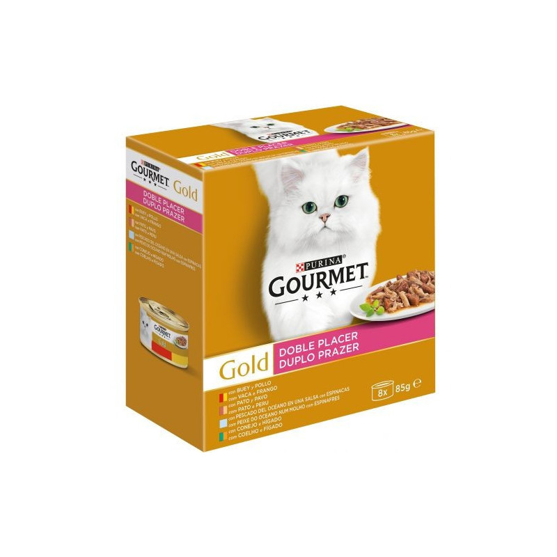 Tu gato es un verdadero experto y le gusta probar diferentes texturas y sabores cada día. Por eso GOURMET Gold ha creado Doble Placer, sabrosas recetas para mimar su sofisticado paladar con una experiencia diferente de sabor en cada comida. Tiernos trocitos combinados con láminas dulcemente cocinadas: la combinación ideal de dos texturas diferentes en la misma comida para ofrecer a tu gato el placer de una sutil mezcla de gustos y texturas.