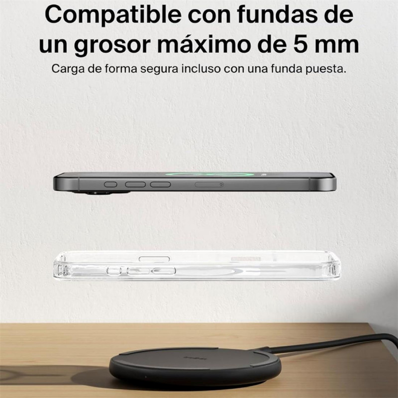 Este cargador ha sido sometido a rigurosas pruebas de calidad y rendimiento bajo el estándar de seguridad Belkin SmartProtect. Además, puedes cargar tu móvil con una funda puesta, siempre que su grosor no supere los 5 mm, garantizando así una carga eficaz y segura.