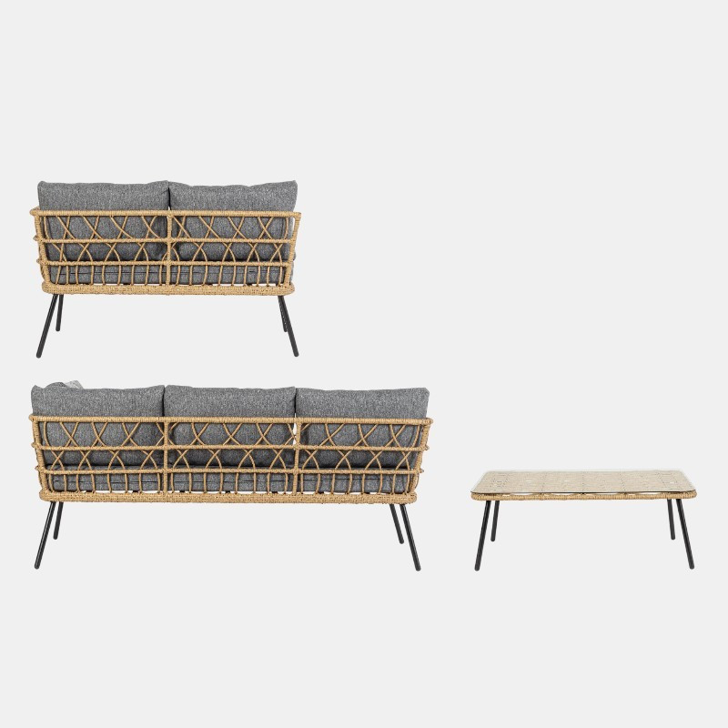 Los cojines, desenfundables y confeccionados en tejido spun poly (100 % poliéster), ofrecen un confort óptimo para el uso diario. La mesa de centro incorpora un tablero de vidrio templado, aportando ligereza visual y facilidad de mantenimiento.