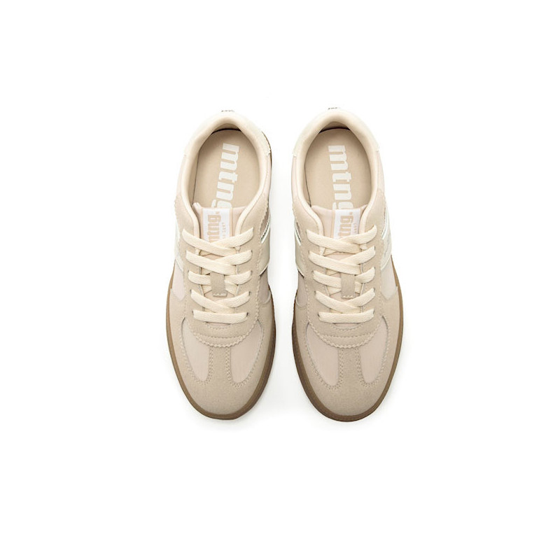 Zapatillas de color rosa claro para mujer, modelo Roy de la marca Mustang. Con una silueta clásica y detalles en blanco roto, este diseño destaca por su versatilidad y acabado retro. La franja lateral con logo bordado, las bandas plateadas y la suela tipo cupsole en tono caramelo aportan un toque vintage ideal para looks casuales. La combinación de texturas y el acolchado interior hacen que se adapten fácilmente a distintos estilos sin perder personalidad. Con certificado VEGANO sellado por INESCOP, el cual garantiza que la naturaleza química principal del material no se corresponde con fibras de origen animal.Modelo60860< Arena - BulleGéneroMujer