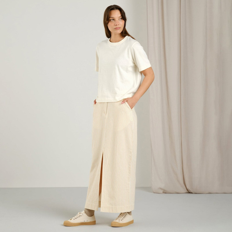 Una falda larga de corte recto con cintura alta y una silueta rectilínea. Se ajusta a la cintura y las caderas, y luego cae recta hasta el suelo con una abertura delantera que facilita el movimiento. La paleta «Work Stripe Yellow» presenta finas rayas verticales amarillas sobre un fondo crudo, creando un look fresco inspirado en la ropa de trabajo. Acabada con cremallera, bolsillos laterales, presillas para el cinturón, canesú trasero y un botón de corozo. Confeccionada en algodón orgánico certificado que apoya prácticas agrícolas mejoradas. Combínala con una camiseta por dentro y zapatillas deportivas, o con la chaqueta a juego y sandalias para un look a juego. - 100 % algodón orgánico - Corte recto; cintura alta - Largo maxi con abertura delantera - Cremallera y bolsillos laterales; presillas para el cinturón - Canesú trasero; botón de corozo