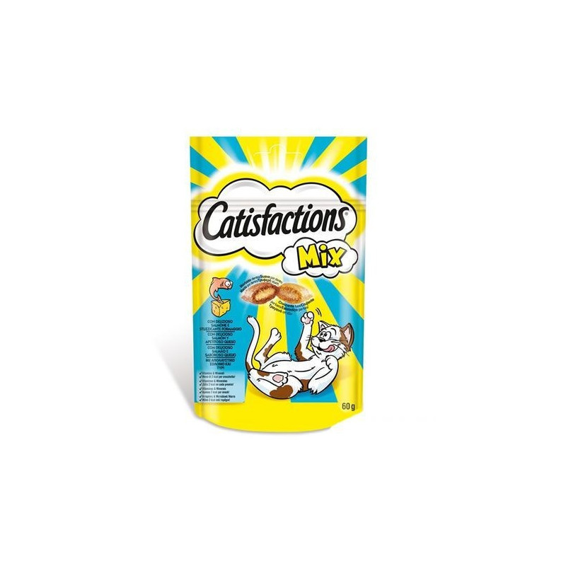 El snack para gatos Catisfactions mix de queso y salmón es un alimento complementario diseñado para la alimentación de gatos adultos y gatitos. Se trata de una irresistible chuchería, deliciosa en su sabor, lo que la hace perfecta como premio para tu felino. A tu mascota le fascinará y conquistará su paladar, gracias a la combinación de aromas.
