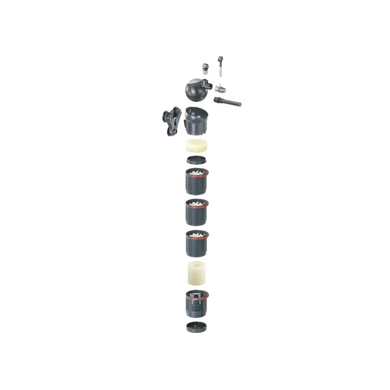 - Construcción modular con cerradas cestas filtrantes, llenas de EHEIM SUBSTRATpro; Cesta de entrada con cartucho filtrante (se pueden usar también otros materiales filtrantes)
