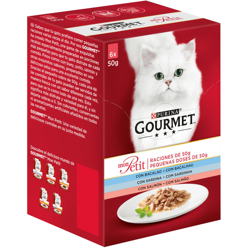 GOURMET Mon Petit es una gama de exquisitas recetas de GOURMET especialmente desarrolladas para que tu gato disfrute de una amplia variedad de sabores en su justa medida: finos cortes con carnes o pescados preparados en una deliciosa salsa para una excelente comida. GOURMET Mon Petit está presentado en un pequeño sobre de 50g, por lo que cada una de las comidas de tu gato pueden ser servidas de manera fresca para que se lo coma todo de una vez, lo que significa más disfrute y variedad para él, y sin dejarte sobras.