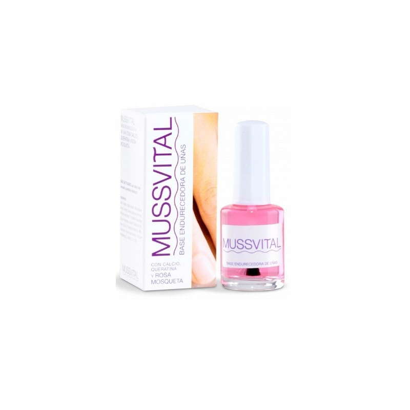 Mussvital base endurecedora de uñas con calcio, queratina y rosa mosqueta, refuerza y protege las uñas y ayuda a suavizar las estrías.