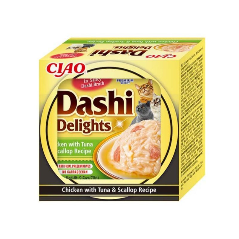 Dashi delights permitirá disfrutar a todos los gatos de la auténtica comida tradicional japonesa con este caldo de pollo, atún y vieira. Elaborado a partir de hojuelas de atún listado, conocido por su rico sabor.