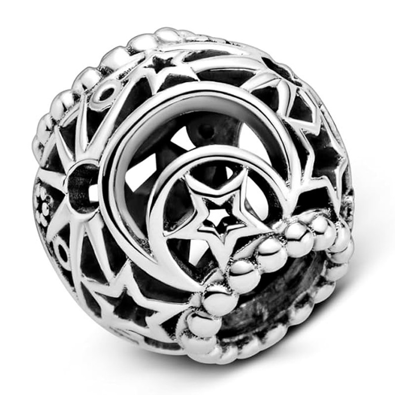 Lleva contigo una guía de la galaxia con el Charm Sol, Estrellas y Luna en Filigrana. Acabado a mano en plata de primera ley, esta joya repleta de detalles es una celebración de lo celestial. Con bordes adornados de esferas alrededor del charm, la luna creciente recortada, los motivos de filigrana del sol y las estrellas decoran este diseño místico. Combina esta joya con tus charms favoritos para crear una pulsera Pandora Moments que sea igual de espiritual que especial.