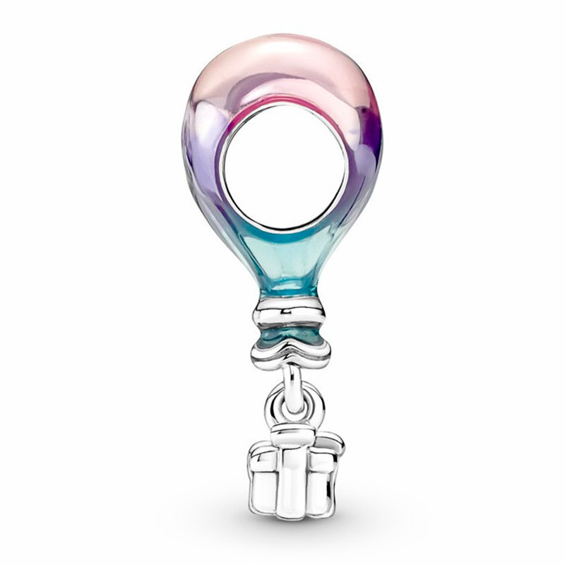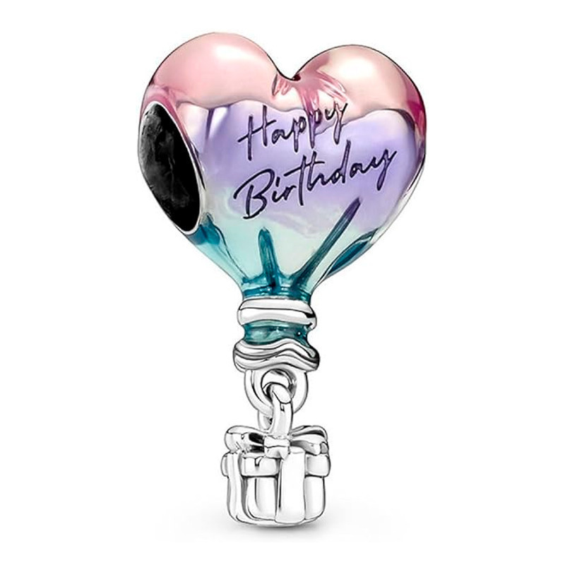 Permite que su espíritu se eleve con el Charm Globo Aerostático Feliz Cumpleaños. Acabado a mano en plata de primera ley, el globo con forma de corazón se presenta amorosamente revestido con esmalte transparente en colores púrpura, rosa y azul y con detalles de pliegues que aportan un toque realista. Un pequeño regalo cuelga del globo con cintas. El regalo perfecto para esos amantes de la aventura