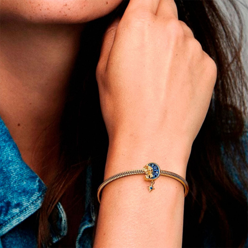 Lleva a tus personajes favoritos con el Charm Luna Creciente de Mickey Mouse & Minnie Mouse de Disney. Mickey Mouse y Minnie Mouse viajan a las estrellas en su propia y brillante luna creciente. Este charm se presenta adornado con cristal artificial de color azul y nácar artificial de biorresina en forma de luna azul y un patrón de estrellas recortadas. El recubrimiento de oro de 14k será ideal para dar un toque de brillo y color a tu combinación de charms favoritos.