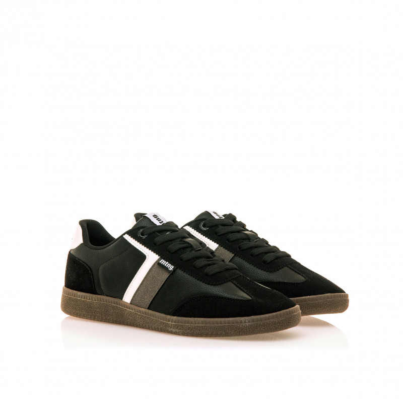 Zapatilla deportiva Nova mtng para chico, inspirada en la clásica bamba de color negro, cierre de cordones planos al tono. Tiene detalle de doble tira en color blanco y plomo en el lateral de la zapatilla junto su trasera blanca, suela de goma cómoda y ligera. Un modelo de tendencia que no puede faltar en tu armario. Con certificado VEGANO sellado por INESCOP, el cual garantiza que la naturaleza química principal del material no se corresponde con fibras de origen animal.