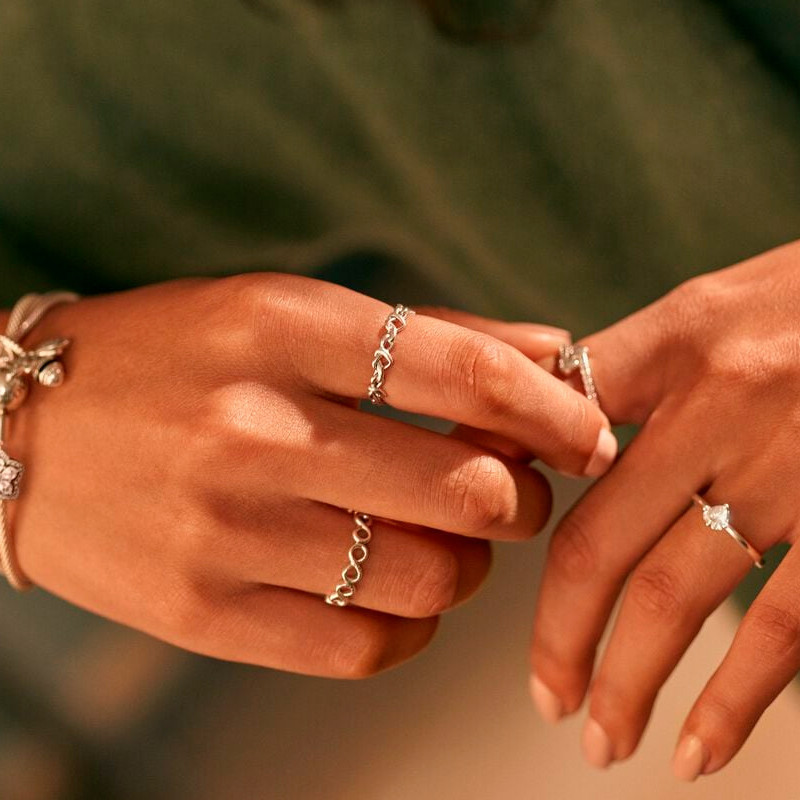 Anillo Pandora Corazones Anudados en plata de primera ley, adornado con circonitas cúbicas transparentes.