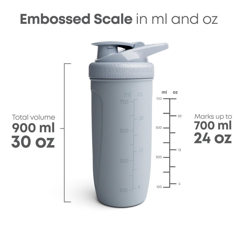 El shaker de la marca SmartShake es un mezclador resistente y de calidad. Fabricado con acero inoxidable de grado alimenticio, es ultradurable e higiénico. Su tapa a prueba de fugas y su asa de agarre suave lo convierten en el compañero ideal para tu estilo de vida saludable. El acero inoxidable es uno de los materiales más higiénicos disponibles.   Detalles: *  Marca SmartShake (una de las mejores del mercado). * Material en acero inoxidable. * Capacidad de 900 ml (marcados 700 ml). * Mililitros marcados dentro y fuera de la botella. * Medidas de 9,2 x 9,2 x 24,5 cm. * Duradero y a prueba de fugas.