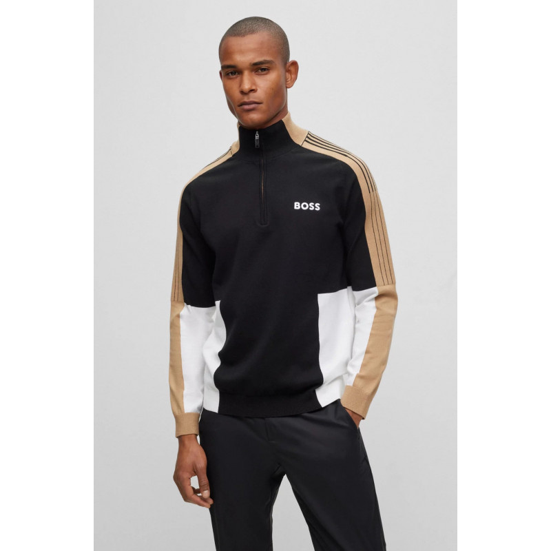 Un jersey BOSS Hombre regular fit repelente al agua con cremallera en el cuello, detalle de la marca bordado y bloques de color de aire deportivo. Regular fit Cremallera en el cuello Manga larga Largo estándar 79% Algodón, 20% Poliester, 1% Fibra sintética elástica 30 °C cuidado fácil No usar lejía No secar en secadora Planchar a media temperatura No limpiar en seco con productos químicos