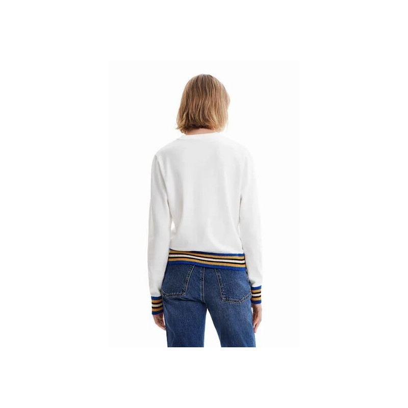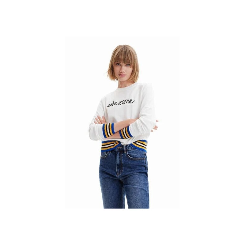 Un fino jersey de punto de Desigual, de cuello redondo con bordado de lentejuelas que deletrean la palabra "Awesome" en el frontal que traducida significa "increíble". Los puños y bajos elásticos tienen un estampado de rayas en colores llamativos que hacen contraste con el resto de la prenda dándole un toque único a esta pieza básica.