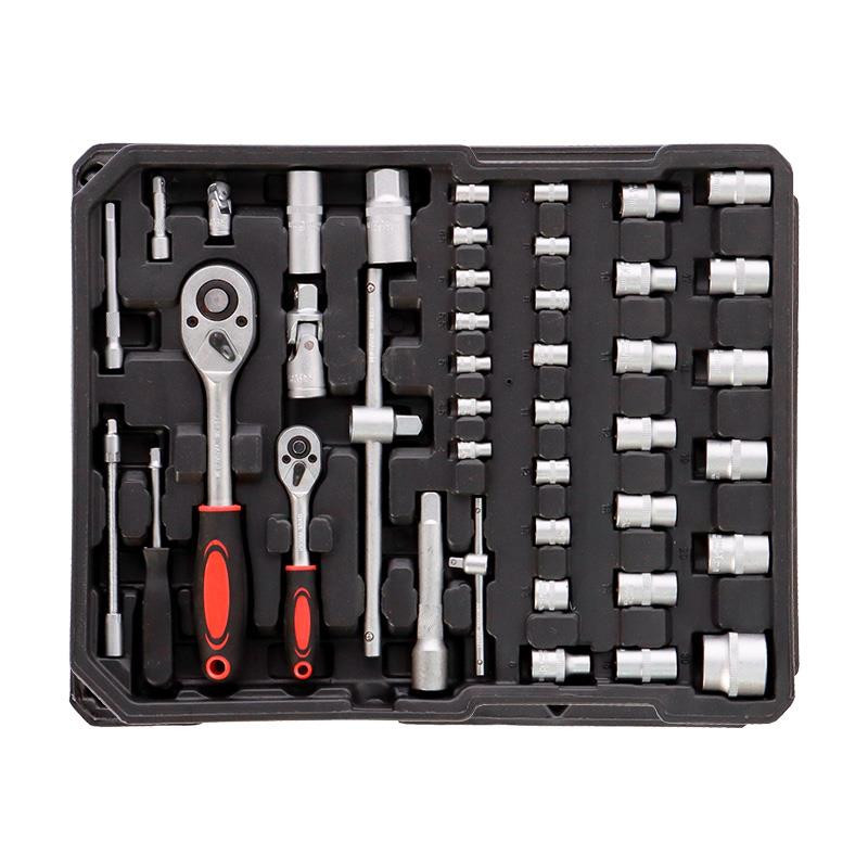 • Mango corredizo 1/4", 12pcs Vasos 1/4", 17pcs Vasos 1/2". 4 Ext, 1pcs Ext flexible, 2pcs Vasos bujías 1/2".