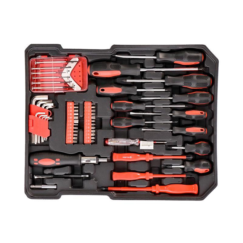 • Destornillador de chicharra, Mango de maniobra, Llave ajustable 8", 10 llaves combinadas, Tester 100-220V.