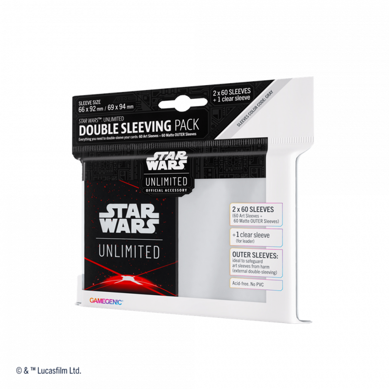 El Star Wars™: Unlimited Double Sleeving Pack contiene nuestras increíbles fundas Master Art Sleeves y fundas externas mates para proteger un mazo completo de hasta 60 cartas de juego de tamaño estándar. Las fundas Master Art Sleeves permiten una sensación increíble al barajar.