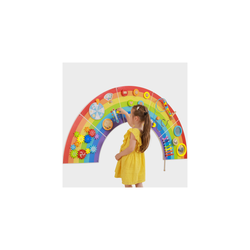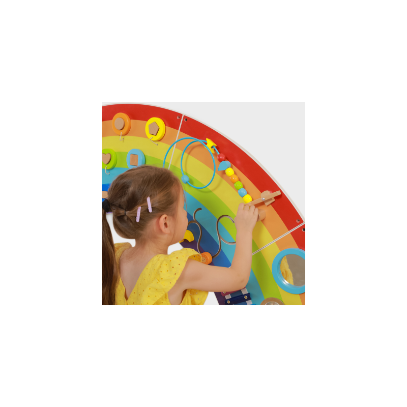 Juguete de pared de madera con cinco secciones, cada una con un conjunto diferente de actividades manipulativas para fomentar la coordinación ojo-mano y la motricidad fina, incluyendo engranajes entrelazados, ruedas meteorológicas giratorias, emparejamiento de formas, xilófono y espejos, y un laberinto de cuentas de alambre. Ideales para el juego individual o colaborativo, estos retos ofrecen a los niños una variedad de oportunidades de aprendizaje práctico que incluyen la resolución de problemas y el desarrollo del lenguaje. El conjunto consta de 5 paneles con orificios de fijación y tornillos de sujeción para una fácil instalación en la pared. Fabricado en MDF y recomendado únicamente para uso en interiores. Requiere montaje por parte del cliente. Edad: 18 meses o más Advertencia: No apto para niños menores de 18 meses. Cordón largo/Cadena larga. Peligro de estrangulamiento. Dimensiones: 1620 mm (largo) x 810 mm (ancho) x 15 mm (profundidad)