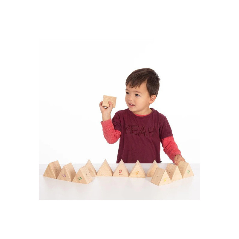 Juego de Prismas de Madera contiene seis pares de hermosos prismas triangulares de madera. Cada prisma de madera dura tiene un logo de nota musical de color que solo aparece en un extremo del bloque, por lo que se puede voltear para que su hijo explore qué bloques producen diferentes sonidos y aprenda a emparejar. Un gran juego para jugar con su hijo para fomentar el descubrimiento del sonido y las habilidades lingüísticas. El set incluye: 12 prismas de madera. Tamaño: 5cm x 6cm. Edad: Apto desde 18 meses.