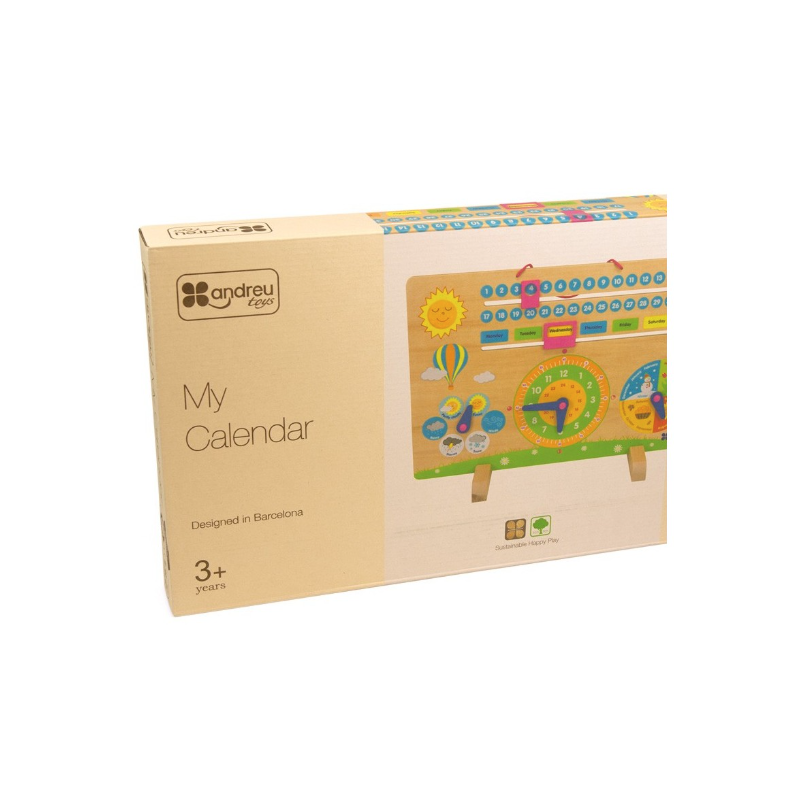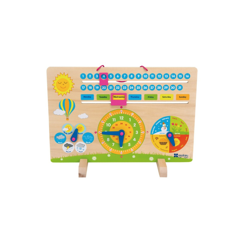 Calendario con soportes, para aprender y anotar las estaciones, los meses, los días de la semana, la hora y la meteorología de hoy. Versión en Inglés. Incluye soportes. Medidas del producto: 45 x 30 x 2 cm Edad recomendada: + 3 años