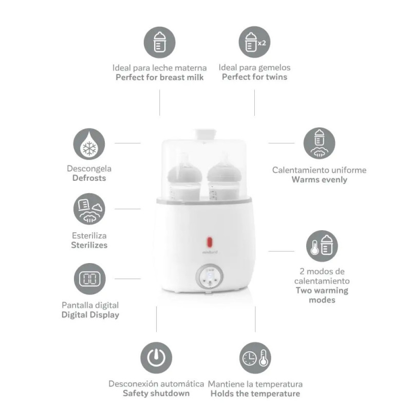 - ¡Ideal para gemelos o mellizos! Warmy Twin permite calentar homogéneamente hasta dos biberones a la vez, lo que permitirá ahorrar tiempo a padres de gemelos o mellizos.