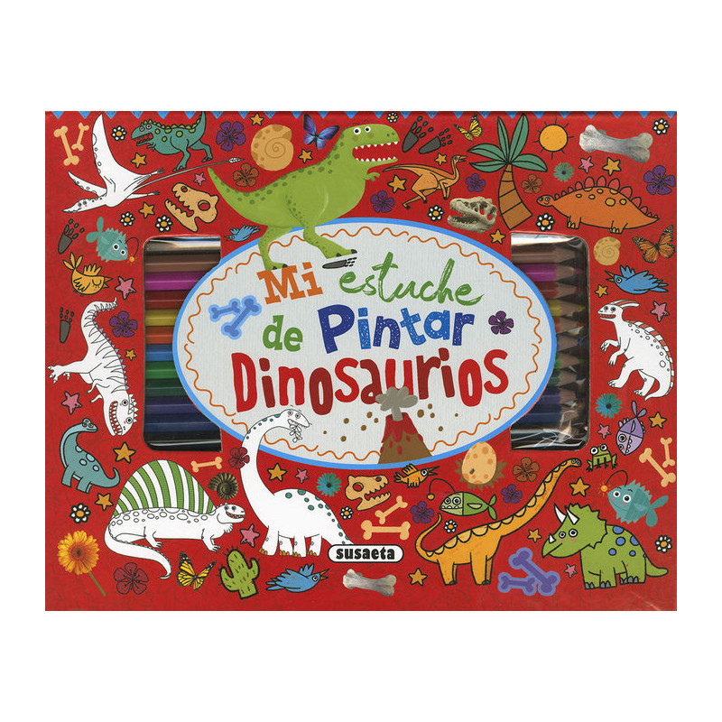 Abre este fantástico estuche de dibujo y colorea las simpáticas ilustraciones de dinosaurios del bloc con las pinturas que encontrarás en el interior.