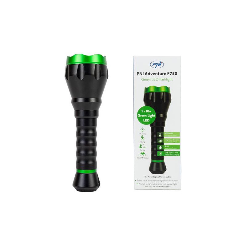 PNI Linterna de aluminio Adventure F750 Green Light, LED 10W, 500 lm, hasta 850 m, IP44, batería de 4000 mAh incluida, carga a través de USB Tipo-C, luz verde perfecta para la caza