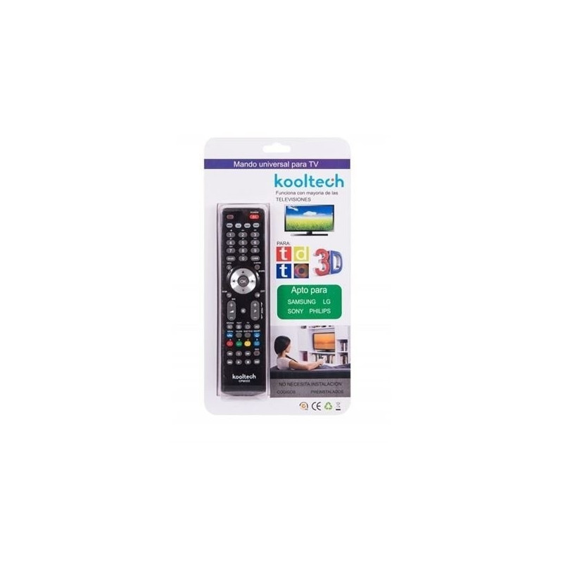 El mando universal Kooltech CPM 322 es un control remoto 4 en 1 diseñado para funcionar sin configuración inicial con la mayoría de televisores de las marcas Samsung, LG, Sony, y Philips.
