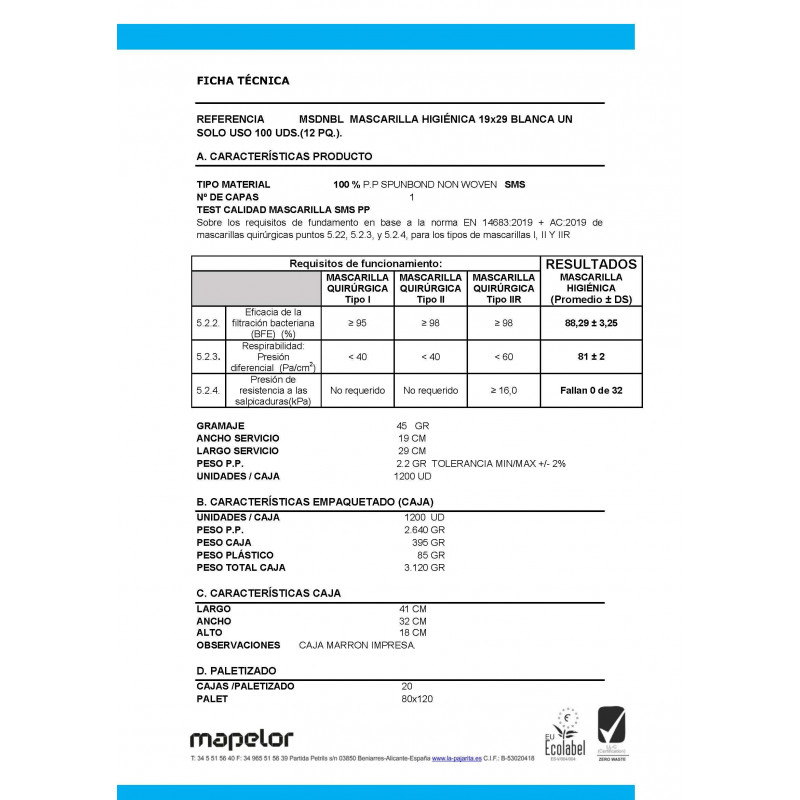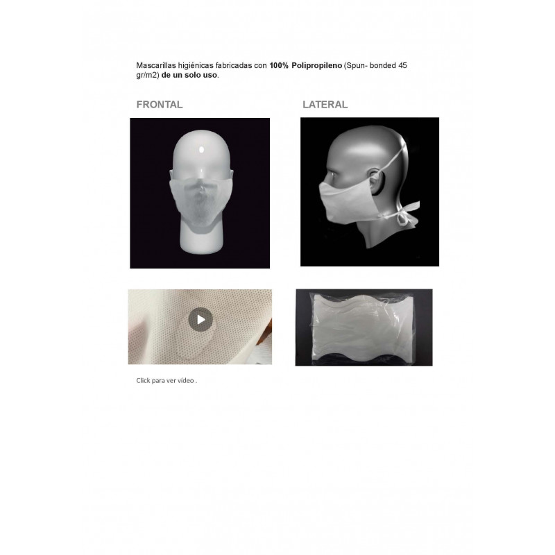 Mascarillas higiénicas fabricadas con 100% Polipropileno (Spun- bonded 45 gr/m2) de un solo uso.