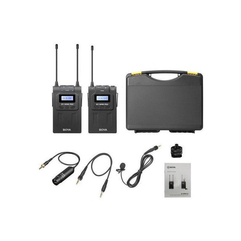 El Boya BY-WM8 Pro-K1 UHF Set de Micrófono Inalámbrico está formado por un receptor portátil de 2 canales, un cuerpo de transmisor y un micrófono lavalier con característica omnidireccional (rango de frecuencia: 626 - 668MHz). El Boya BY-WM8 Pro-K1 es un sistema de micrófono inalámbrico UHF mejorado para grabación de audio con dos sujetos e incluye una pantalla LCD fácil de leer, un amplio ancho de banda RF seleccionable, ajuste PLL sintetizado y circuitos digitales compuestos. Incluyendo el cuerpo de transmisor y receptor con una montura de cámara, será apropiado para recogida electrónica de noticias, producciones electrónicas en el terreno, producciones de películas y muchas cosas más.