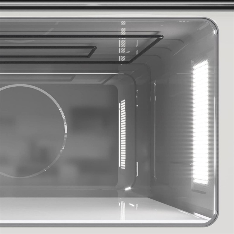 El interior del microondas está fabricado en acero inoxidable, lo que garantiza durabilidad y facilidad de limpieza. Cuenta con un plato giratorio de 24,5 cm para una distribución uniforme del calor.