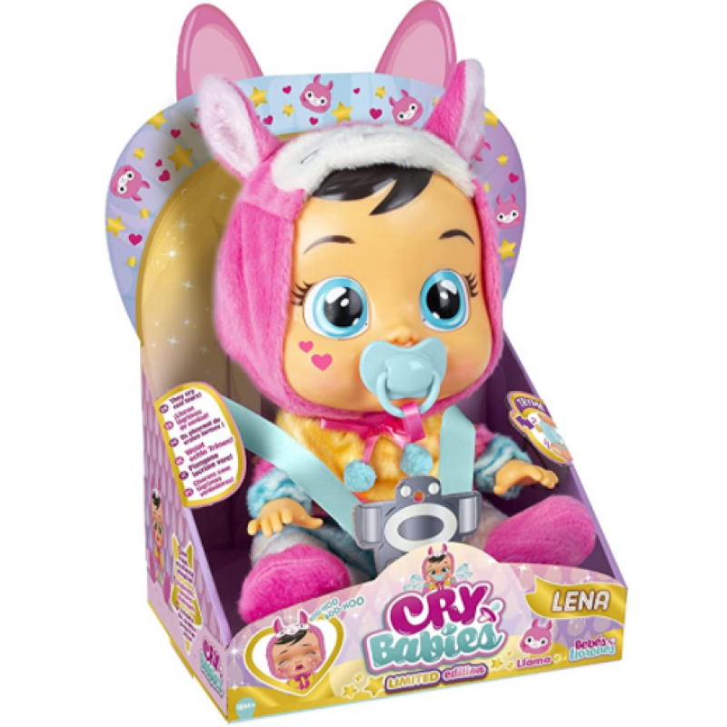 íLos Bebés Llorones lloran de verdad! Si le quitas el chupete a LENA llora con lágrimas de verdad y sonidos que aumentan del pucherito al llanto. También puedes tumbarla para que pare de llorar. Viene con un chupete y pijama intercambiable de estampado animal.