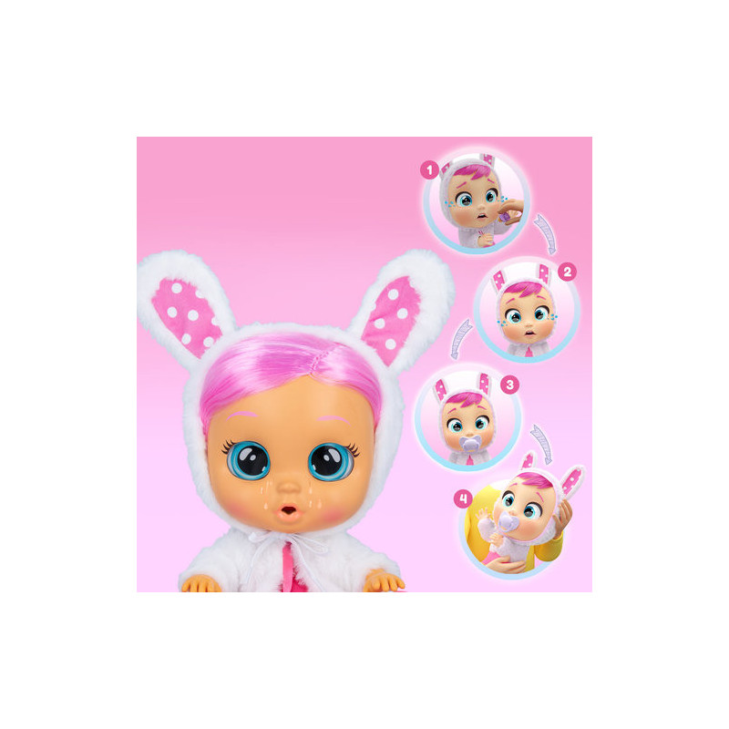 íDescubre la nueva Bebé Llorón Coney! Ahora tiene pelo de verdad, ojos de cristal y una cara más suave y mejorada. Además, la nueva Bebé Llorón Coney tiene un peso más ligero y, por primera vez, ílleva ropa de verdad y zapatitos a juego! Como todos los Bebés Llorones, íLlora lágrimas de verdad cuando le quitas el chupete! íPónselo otra vez o no dejará de llorar y cada vez lo hará más fuerte! íY también la puedes tumbar para calmarla! Coney incluye un conjunto de ropa, un par de zapatos y un chupete a juego. Edad recomendada a partir de 18 meses.