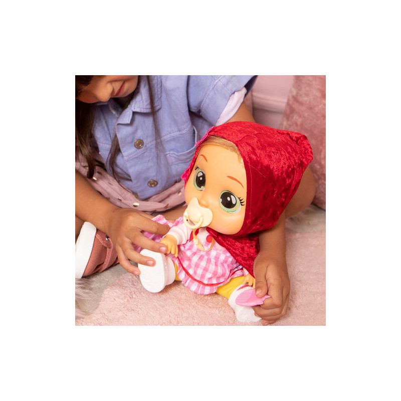 íDescubre al Bebé Llorón Scarlet que llega desde Storyland! íScarlet llega de uno de los cuentos más conocidos! Como todos los nuevos Bebés Llorones, Scarlet tiene pelo de verdad, ojos de cristal y una cara más suave y mejorada. Además, tiene un peso más ligero y, por primera vez, ílleva ropa de verdad y zapatitos a juego! Como todos los Bebés Llorones, íñlora lágrimas de verdad cuando le quitas el chupete! íPónselo otra vez o no dejará de llorar y cada vez lo hará más fuerte! íY también la puedes tumbar para calmarla! Scarlet incluye un característico conjunto de ropa con capa, un par de zapatos y un chupete a juego. Edad recomendada a partir de 18 meses.
