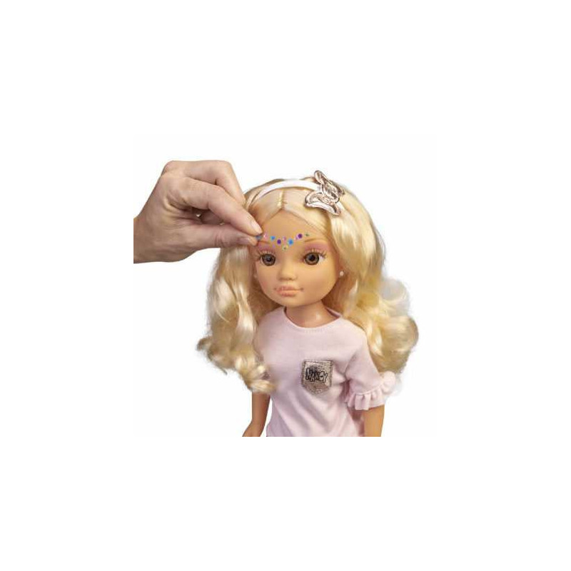 La nueva Nancy un día de belleza tiene un tocador lleno de accesorios para jugar, además incluye una butaca con soporte para que la muñeca quede bien sujeta mientras la niña juega a peinarla y maquillarla. Incluye más de 18 accesorios como planchas de pelo, secador, cremas y stickers y maquillaje real para maquillar a la Nancy. Viste un moderno look: pantalones metalizados, camiseta con volantes y diadema de mariposa. Pelo largo y rizado con ojos marrones.
