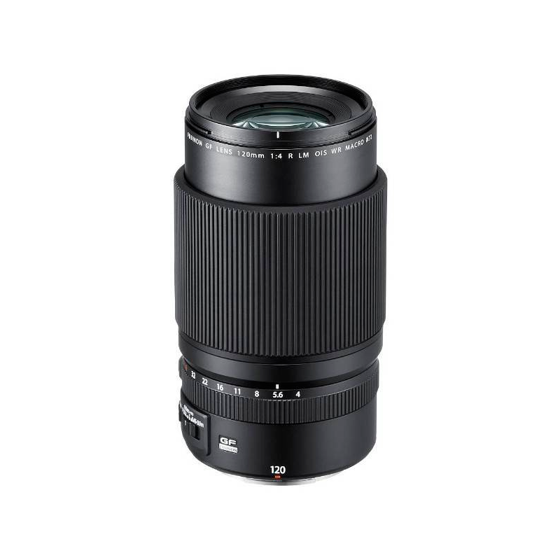 - TipoGF 120 mm F4 R LM OIS WR MacroConfiguración de lente14 elementos 9 grupos (incluye 3 elementos de dispersión baja extra)Distancia focal (equivalente de formato de 35 mm)f=120 mm (95 mm)Ángulo de visión25,7°Apertura máx.F4Apertura mín.F32Control de apertura