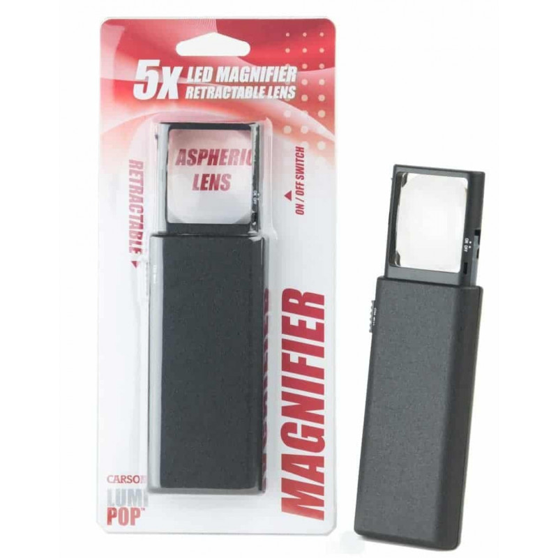 La lupa de bolsillo LumiPop™ LP-66, tiene un aumento de 5x, es compacta, plegable y se guarda dentro de un estuche plástico. Su lente asférica, de acrílico transparente ofrece una imagen clara, sin borrosidades y escasa o casi sin distorsión. Perfecta para leer letras pequeñas con poca iluminación. Tiene un interruptor para encender y apagar la luz LED super brillante. La lupa de bolsillo LumiPop™ es tan compacta que puede llevarla en el bolsillo de la camisa.