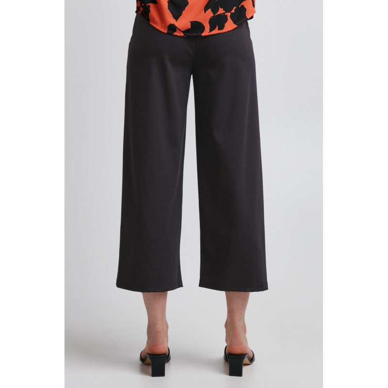 Pantalón tipo jogger de la línea Kate de ICHI en formato culote o ancho de pierna y capri. Estilo: 20116301 Composición: 74% Poliéster Reciclado, 22% Viscosa, 4% Elastano Corte: corte recto, cintura normal, largo recortado, pierna recta