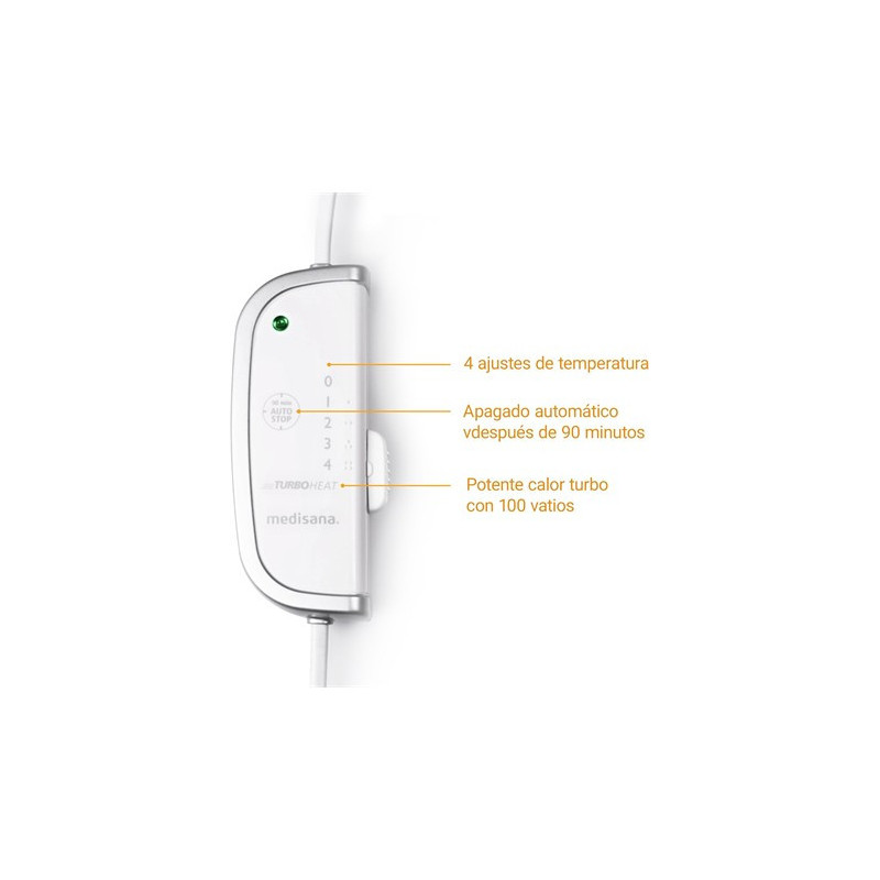 El sistema del hilo calefactor flexible y el sistema de sensores de matriz proporcionan a la nueva tecnología Medisana 4D una distribución de calor agradable y uniforme que se puede sentir rápidamente. Equipada con la tecnología APS con sistema de seguridad activa, el control visual y acústico de la temperatura y una desconexión automática después de 90 minutos, la almohadilla térmica para el hombro HP 630 tiene muchas características prácticas.