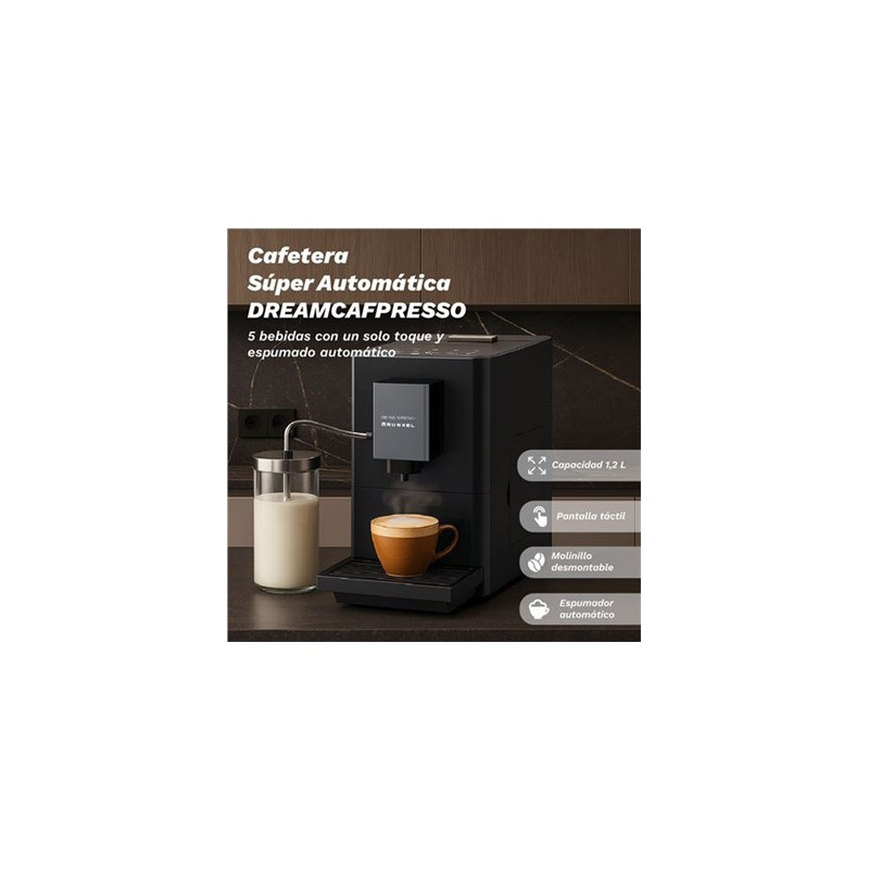 Cafetera superautomática con las mismas especificaciones que el modelo DARKCAFPRESSO: 20 bares, depósito de 1,2 litros, 130 g de capacidad de grano, pantalla táctil y molinillo desmontable. Las medidas son 18 x 42 x 33 cm. La diferencia está en el acabado estético.