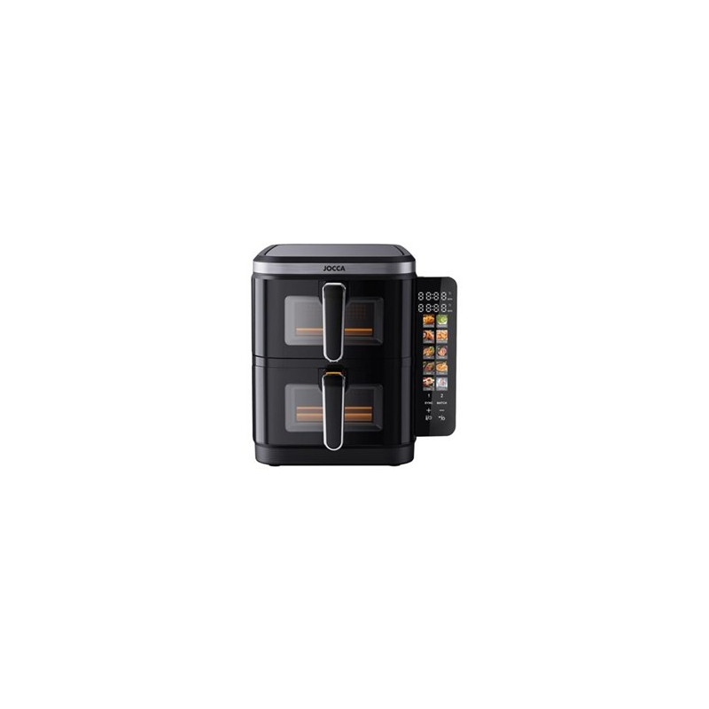 Freidora de aire con dos compartimentos independientes de 5,5 litros cada uno, 11 litros en total. Cada cajón tiene su propio control de temperatura (60-200°C) y tiempo (1-60 min), así que se pueden cocinar dos platos distintos en paralelo sin que se mezclen sabores. La pantalla es LED táctil en color y los compartimentos tienen ventana con iluminación interior.