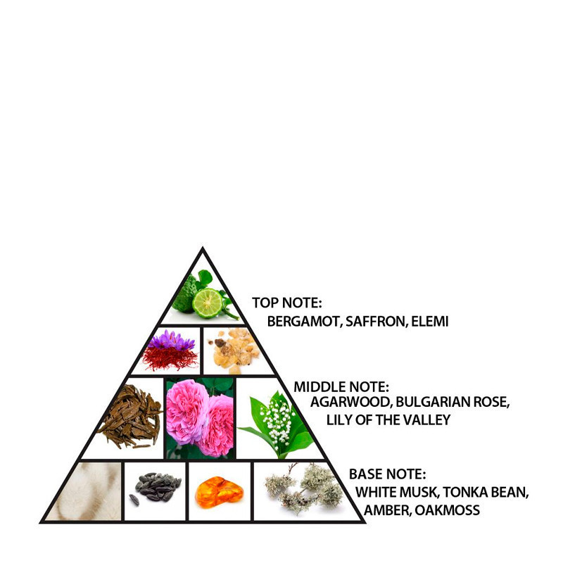 - Notas de corazón: Rosa de Bulgaria, madera de oud y lirio de los valles, ofreciendo un corazón floral y amaderado que añade profundidad y sensualidad.
