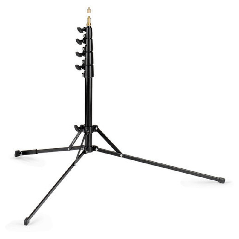 Manfrotto NANO PLUS 5002BL de 5 secciones . El soporte se eleva a una altura máxima de 6.5 ', tiene una altura mínima de trabajo de 20.5', una huella estable de 36 "y puede soportar el engranaje (montado en su perno de 5/8" con 1/4 "-20 y 3 / 8 "-16 hilos) con un peso de hasta 8.8 lb a la altura máxima. Una de las características útiles del soporte es su pata de nivelación ajustable independientemente, que es un activo real cuando se trabaja en espacios reducidos o superficies irregulares. El diseño de patas plegables en reversa del soporte le permite dividirse a solo 20.5 "de largo, mientras que su peso de solo 3 lb seguramente lo convertirá en el favorito de los fotógrafos de naturaleza y ubicación, así como de mochileros y campistas.