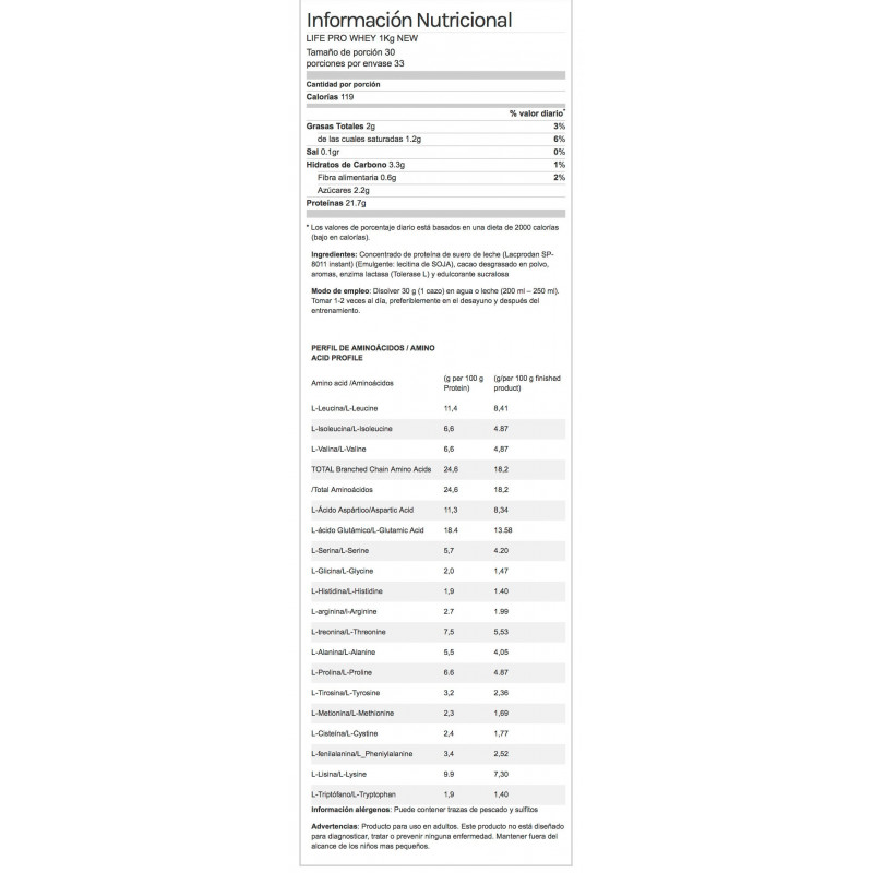 Life Pro WHEY es un suplemento de concentrado de proteína de suero perfecto para cualquier deportista que necesite un aporte proteico extra. Con una calidad muy alta, este producto ofrece un valioso 78 % de proteína sin malos aditivos. Además, cuenta con Lactase Enzyme (Tolerase L), suplemento de enzimas que se utiliza para ayudar a las personas que sufren de intolerancia a la lactosa.   Detalles: * Con enzimas digestivas (Tolerase L).  * Aporta un 78 % de proteínas. * Proteínas con un rico perfil de aminoácidos. * Sin azúcares. * Bajo en carbohidratos. * Protege los músculos frente al catabolismo. * Mejora el rendimiento físico. * Facilita el crecimiento de masa muscular. * Ayuda a la recuperación muscular.