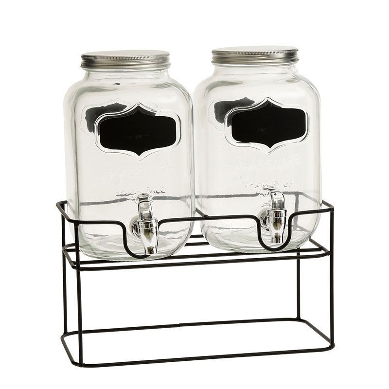 Juego de 2 depósitos de cristal de 4 litros cada uno con soporte metálico. Ideal para fiestas o comidas en el exterior ya que gracias a sus etiquetas podrás identificar lo que se encuentra en su interior y servir dos bebidas distintas a la vez.