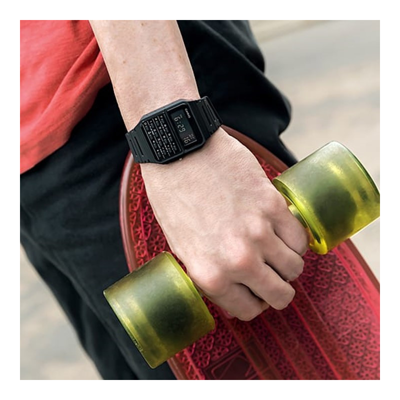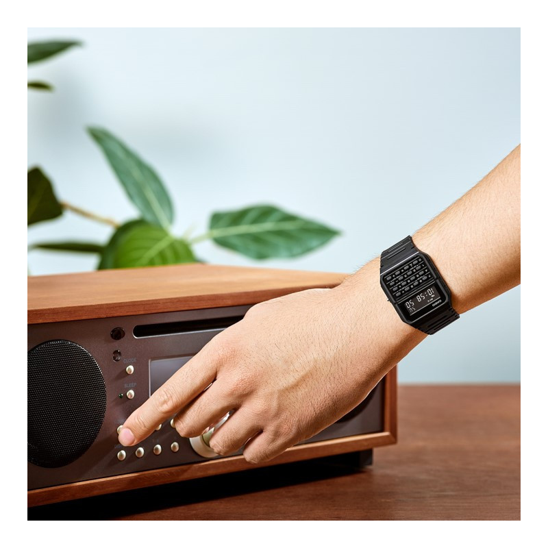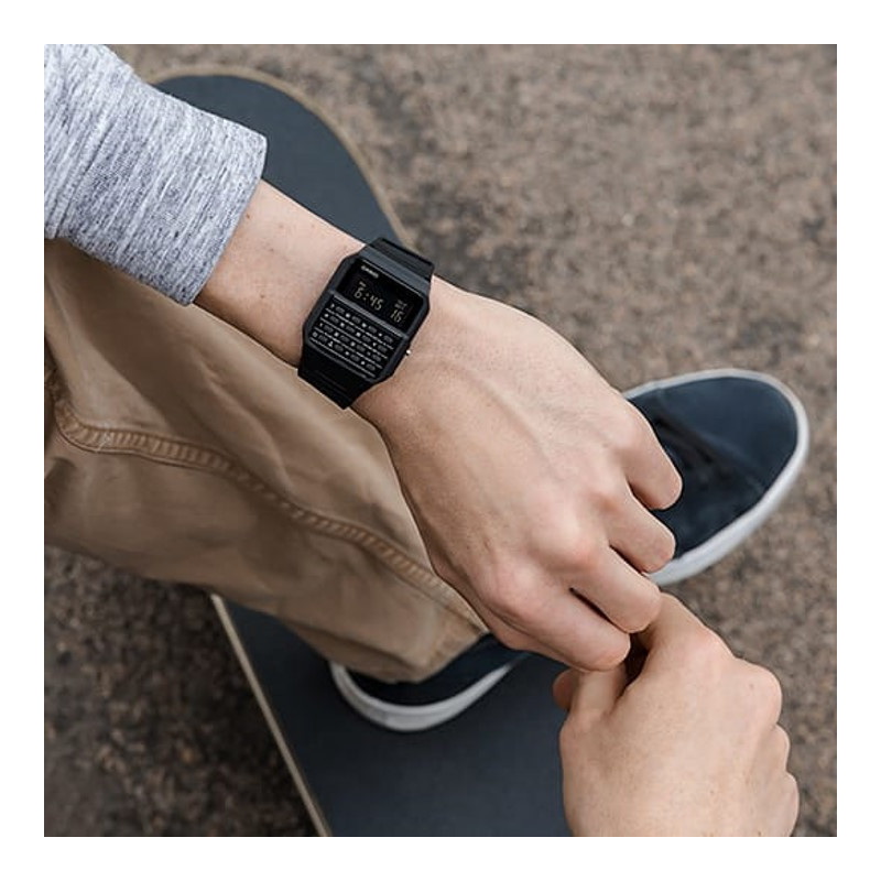 El Casio CA-53WF-1B es un reloj digital retro con calculadora incorporada, ideal para los amantes del estilo vintage funcional. Su diseño completamente negro ofrece una estética moderna y minimalista. Equipado con cronómetro, hora dual, alarma diaria y calendario automático. Su ligereza y resistencia al agua lo hacen perfecto para el día a día. Producto original Casio con garantía oficial incluida.