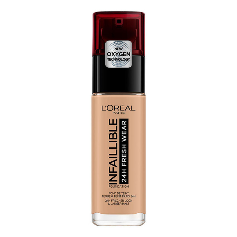 La base de maquillaje larga duración y cobertura modulable Infalible 24H Fresh Wear de L'Oréal París lo resiste todo. Ocasión de usoPor las mañanas, después de la prebase y antes de los polvos matificantes. Resultados del productoPiel fresca e hidratada, sin efecto máscara durante 24H.Formulación No ComedogénicoTexturaFluidoAcabadoNatural Ingredientes destacados del productoSu nueva fórmula con pigmentos finos ultra-concentrados que se adaptan perfectamente al tono de tu piel.CoberturaMoldeableEfecto complexión cara Sin efecto máscara.Tipo de pielTodos los tipos de Piel.